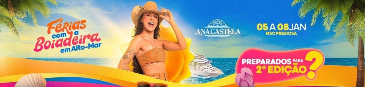 Depois do sucesso da primeira edição, o evento Navio Ana Castela – Férias com a Boiadeira em Alto-Mar está ainda melhor! Prepare-se para dias de pura diversão, música sertaneja e momentos únicos em alto-mar. Shows exclusivos, festas animadas e a energia contagiante da Ana Castela te aguardam nessa experiência inesquecível. Garanta sua cabine agora e venha viver essa festa incrível!